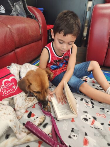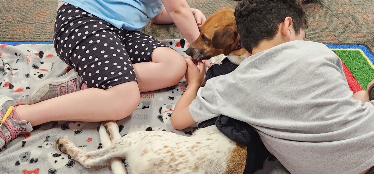 Estudiantes leyendo con Reese, el perro de terapia de Brady.