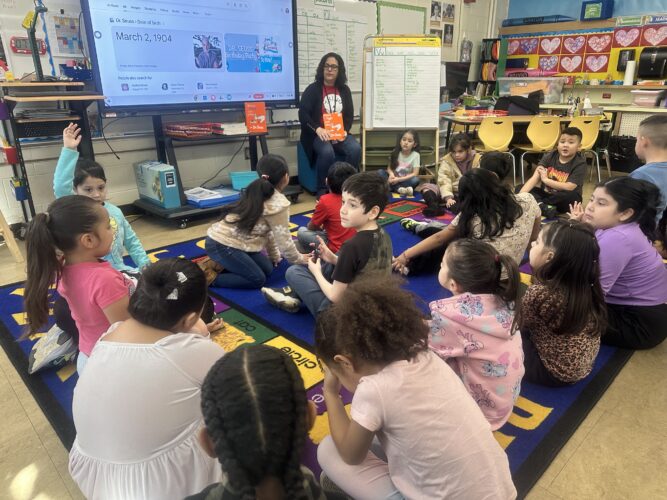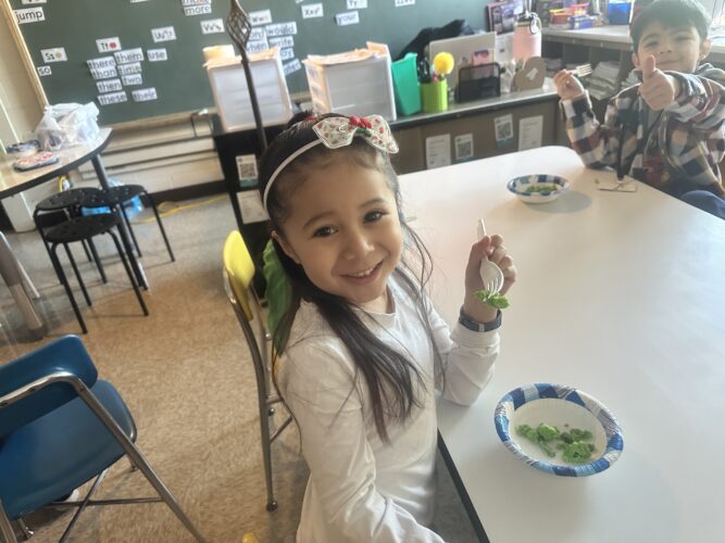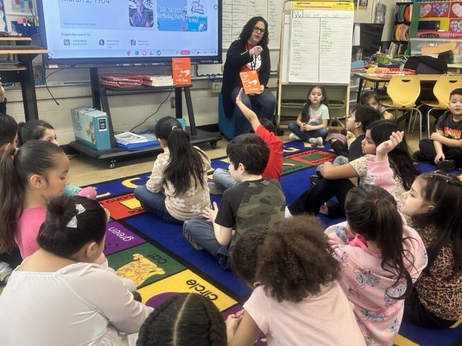El lunes 2 de marzo fue el cumpleaños del Dr. Seuss. Los estudiantes de kínder y primer grado participaron en algunas actividades divertidas para celebrarlo. En el salón de la Sra. De Loera, los estudiantes hicieron slime para acompañar el libro “Bartholomew and the Oobleck”. En el salón de la Sra. Purse, los estudiantes decoraron globos aerostáticos de papel y escribieron sobre lo que quieren hacer cuando sean grandes. Esto estaba relacionado con el libro “Oh, The Places You’ll Go” (Oh, los lugares a los que irás). En el salón de la Sra. González, los estudiantes escucharon el cuento “Green Eggs and Ham” (Huevos verdes con jamón) y en el salón de la maestra Mann, los estudiantes pudieron probar huevos verdes con jamón y ver el cuento “The Cat in the Hat” (El gato en el sombrero).