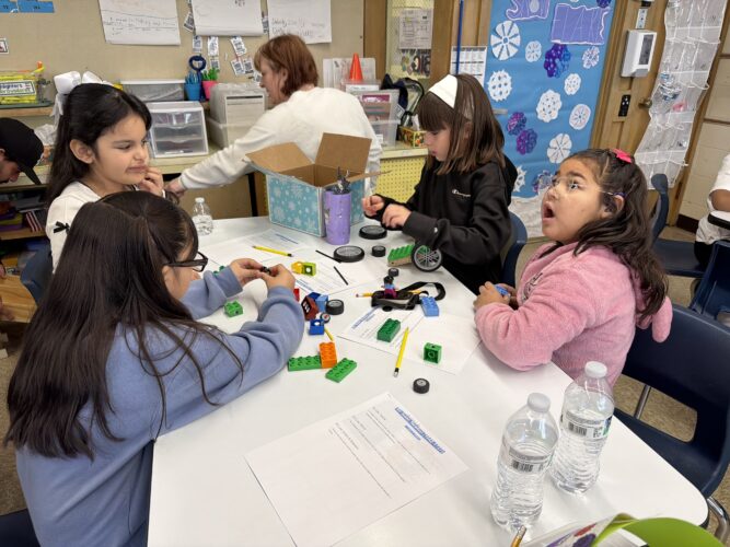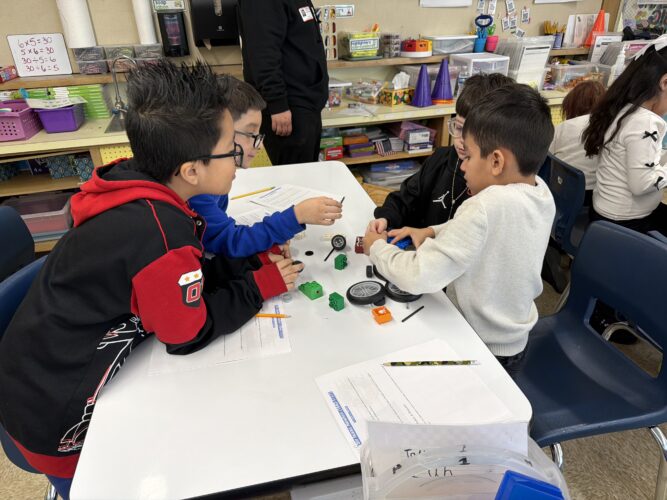 Mrs. Kermer, 3rd grade teacher, invited DuPage Children’s Museum to visit Oak Park school for an in-house field trip. Students were given three challenges to test gravity, friction and momentum. For the gravity challenge, students were asked to see how deep and wide a crater was made by their car traveling down a ramp. For the friction challenge, students placed their car at the top of the ramp for three different surfaces to see which surface their car traveled further down. The momentum challenge asked students to see how much momentum their car had by placing the car at the top of one ramp and seeing how far it traveled up the other side with only momentum to push it up. Students enjoyed building their cars and testing them out in each of the challenges.