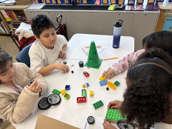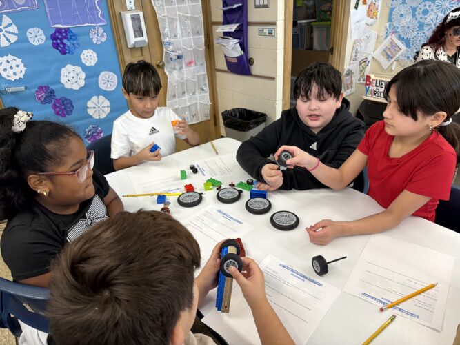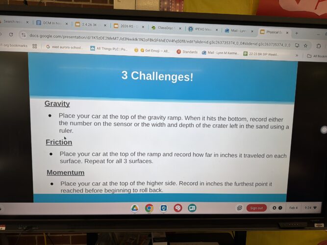 La Sra. Kermer, maestra de tercer grado, invitó al Museo Infantil de DuPage a visitar la escuela Oak Park para realizar una excursión interna. Los estudiantes participaron en tres retos para evaluar la gravedad, la fricción y el momento. Para el reto de la gravedad, debían observar la profundidad y el ancho de un cráter creado por su auto al descender por una rampa. Para el reto de la fricción, colocaron su auto en la parte superior de la rampa en tres superficies diferentes para ver en qué superficie descendía más. El reto del momento les pidió a los estudiantes que comprobaran el momento de su auto colocándolo en la parte superior de una rampa y observando la distancia que recorría por el otro lado, utilizando solo el momento para impulsarlo. Los estudiantes disfrutaron construyendo sus autos y probándolos en cada uno de los retos.