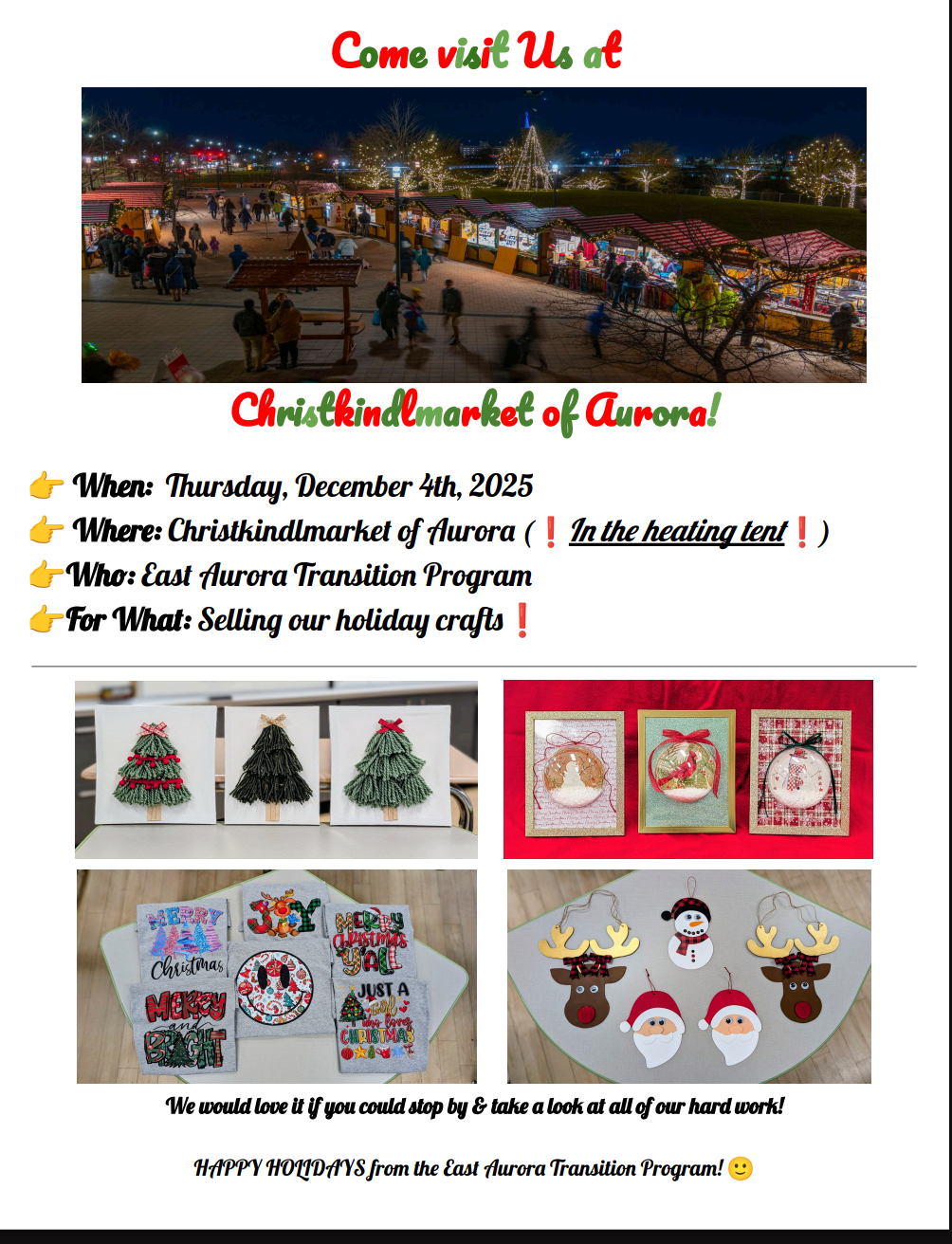 East Aurora High School’s Transition Program has the honor of selling student-made holiday crafts at the Christkindlmarket of Aurora this Thursday, December 4th. EAHS transition students will be selling in the heating tent and will be there from 11:00 am – 2:30 pm. The students have been working hard all month long creating holiday themed crafts to prepare for this event. While many in the District 131 community will not be able to patronize their table at the Christkindlmarket as it is during school hours, organizers are encouraging everyone to help get the word out to friends and family that may have more flexibility with their daytime schedules. Crafts not sold at the market will be made available for purchase to members of the East Aurora High School community in time for the holiday season. Transition faculty member, Ms. Christine Warren, and her students, wish to thank everyone in the EA community in advance for their continued support.