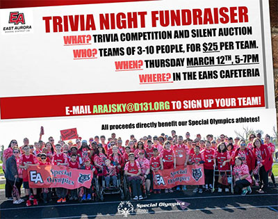 ¡Llamado a todos los fanáticos! El equipo de entrenadores de olimpiadas especiales del Distrito Escolar 131 del Este de Aurora auspiciará una noche de recaudación con el juego Trivia, el jueves 12 de marzo de 5:00-7:00 p.m., en la cafetería de la preparatoria del Este. El evento incluye una subasta silente, como también la venta de pizza y refrigerios. Los equipos de 3 a 10 personas pueden competir para convertirse en los campeones de trivia, por $25 por equipo. Comuníquese con Amy Rajsky vía correo electrónico a arajsky@d131.org para inscribir a su equipo. ¡Se aceptan inscripciones el día del evento o adiciones tardías al equipo! Se aceptan pagos en efectivo o cheque. Todos los ingresos de este evento beneficiarán directamente a nuestros atletas de las olimpiadas especiales.