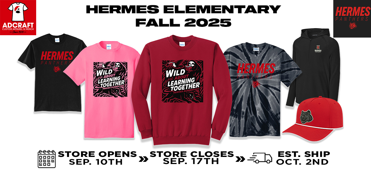 Spirit wear is for sale here: Hermes Spirit Wear Store from September 10th – September 17th. Orders will ship directly to families at home, and are estimated to ship out by October 2nd.