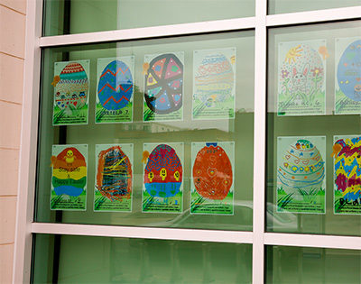 Los visitantes pueden ver la exhibición especial de huevos en las ventanas de la Biblioteca Santori, 101 S. River Street, frente a la Benton Street, en el lado más cercano a la intersección con River Street.