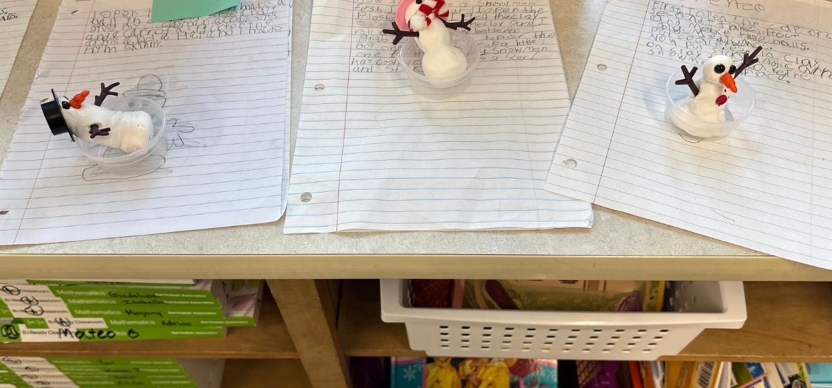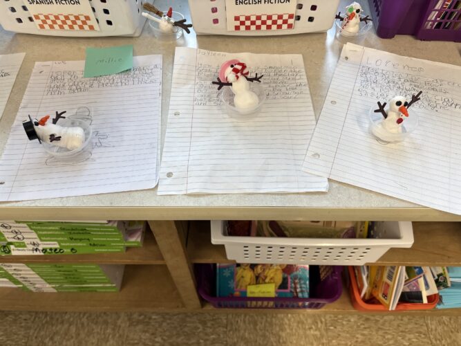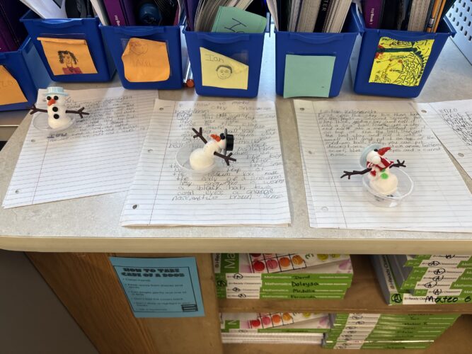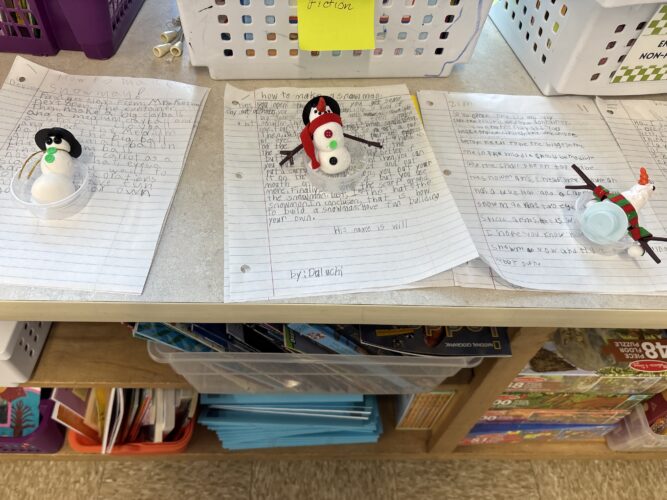 ¿Quieres construir un muñeco de nieve? ¡Los estudiantes de tercer grado pueden enseñarte cómo hacerlo! Los estudiantes comenzaron construyendo su propio muñeco de nieve con plastilina. Luego, practicaron sus habilidades de escritura expositiva para explicar a otros cómo construir un muñeco de nieve. Se aseguraron de explicar los pasos con detalle para que cualquiera pudiera leerlos y construir uno por ellos mismos. Observe algunos de los muñecos de nieve del salón 13.